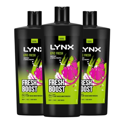 JoybuyLynx 3-in-1 Body Wash Epic Fresh XXXL 700 ml hydrates skin with plant-based moisturisers and delivers a 12-hour grapefruit&tropical pineapple scent. Made with sustainable packaging, it cleanses hair, face, and body for fresh, soft skin all day.