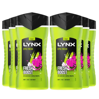 Lynx Epic Fresh Shower Gel Grapefruit & Tropical Pineapple Scent 225ml, 6 Pack The new LYNX Epic Fresh Shower Gel for men transforms your shower from ordinary to extraordinary. When you need life to be as Epic as you are, we’ve got you covered. The invigorating Grapefruit & Tropical Pineapple Scent Men's Shower Gel busts odour and stimulates you to take on the world! No matter how big or small life gets, you’ll always feel refreshed. All new LYNX Epic Fresh Shower Gel now features our long-lasting scents! So, you can smell fresh for 12 hours. Plus our 100% plant-based moisturisers keep your skin feeling irresistibly soft, naturally. All day. All night. No matter what. You’re ready. At LYNX, we believe that one of the keys to attraction is an iconic fragrance. That’s why we’re dedicated to giving you all the tools to ensure that whenever opportunity comes your way, you smell your absolute best. Features: All NEW LYNX Epic Fresh Shower Gel For Men. Make the everyday Epic! A Men's Shower Gel designed to invigorate and reclaim the mundane. Dependable body wash formula that busts odour for 12 hours. Shower gel with essential oils of Grapefruit & Tropical Pineapple Scent. 100% plant-based moisturisers that leave the skin silky to the touch. Body wash pack made with fully recyclable materials. Loving this LYNX Epic Fresh Shower Gel? Try other LYNX deodorant products including LYNX Epic Fresh Body Spray. How to Use: Squeeze out the gel. Lather on the body. Rinse off. Be clean. Smell great. Ingredients: Aqua, Sodium Laureth Sulfate, Glycerin, Cocamidopropyl Betaine, Parfum, Sodium Chloride, Sodium Benzoate, Citric Acid, PPG-6, Lactic Acid, Disodium EDTA, Saccharide Isomerate, Alpha-Isomethyl Ionone, Citronellol, Coumarin, Geraniol, Hexyl Cinnamal, Limonene, Linalool Safety warnings: Avoid contact with eyes. If contact occurs, rinse thoroughly with water Box Contains: 6x Lynx Epic Fresh Shower Gel, 225ml