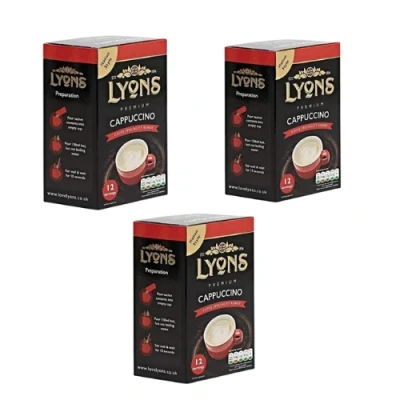 Take a moment to breath and solve all your problems with a steaming, creamy cappuccino. These Lyons Premium Cappuccino sachets are so simple to use, all your have to do is add hot water in order to enjoy a milky and sublime cappuccino drink. The caffeine kick is sure to add the bounce back into your step.. Shop for more instant coffee here.. Each box contains x 12 sachets 15g. Assorted Pack Size. Premium quality and Italian style. 12 servings. Perfect to take on-the-go for a coffee break wherever you are