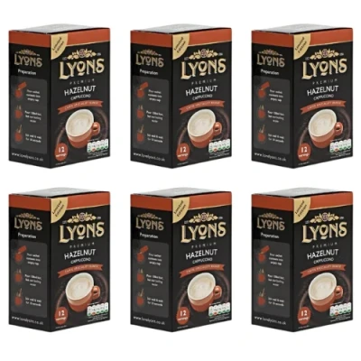 Treat your taste buds to a classic cappuccino with an exciting nutty twist! These Lyons Premium Instant Hazelnut Cappuccino Coffee Sachets include every thing you need for a tasty seasonal treat - simply add hot water! The sweet and rich hazelnut notes are guaranteed to make this drink undeniably irresistible. Pick up a box now so you can have a delicious hot beverage for your next coffee break.. Shop our full range off instant coffee here.. Cappuccino with a burst of indulgent hazelnut. Each box contains x 12 sachets 15g. Limited edition and part of a luxurious caffe specialty range