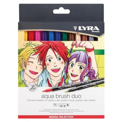 LYRA Aqua Brush Duo, Fine Art Marker Set, Dual Tip, 12 Assorted Colours, Water Soluble Pens, Ideal for Professionals & Students