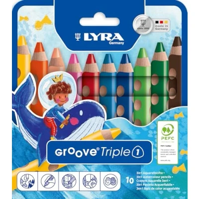 LYRA Groove Triple One 3 in 1 Wooden Colouring Pencils, Triangular, Thick, Lacquered Lead, 10 mm Cardboard Case, Assorted Colours, Count