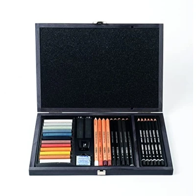 Drawing set with a balanced selection of pencils for monochrome drawing Ideal for portrait, landscape and act painting Mixture of dry and oil pencils Contains 1pc for each of the following: White Pencil Oil, Sanguine Pencil Oil, Sepia light Pencil Oil, Sepia dark Pencil Oil, Charcoal Pencil 2B, Charcoal Pencil HB, Carbon Pencil 3B, Carbon Pencil B, Carbon Extra Dark Pencil 2B, square pastels: White, Yellow Ochre light, Indian Yellow, Raw Sienna, Golden Ochre, Raw Sienna deep, Neutral grey, Warm grey 1, Cool grey 3, Cool grey 4, Payne’s grey, Black, 7x14mm Carbon Extra Dark Square pastel HB, 7x14mm Charcoal Square pastel 2B, Sharpener, Kneadable Soft Eraser, Graphite pencil 9B, Graphite pencil 6B, Graphite pencil 4B, Graphite pencil 2B, Graphite pencil HB, Graphite pencil 2H.