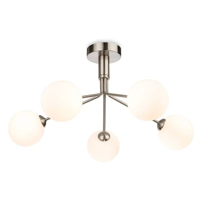 Net LightingAttractive modern 5 light ceiling fitting in a fine quality brushed steel finish. It is complemented by opal white glass shades. Ideal for use in living rooms, kitchens, bedrooms and hallway areas. Also perfect for rooms with lower ceilings.