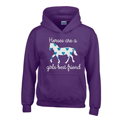 M 12 14 (40") Purple Hoodie Horses are A Girls Best Friend (Design 2) with White Glitter & Blue Sparkling Print