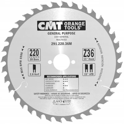 Number of Teeth: 36 Bore: 30 mm varnished MDF (medium-density fibreboard) Diameter: 220 mm Pins 1942/02/07 Kerf: 2,8 mm, Weight: 1.433004703 pounds, Manufacturer: CMT
