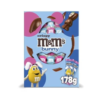 Fun Easter Treat: Enjoy the M&Ms Crispy Bunny Easter Egg, featuring a hollow milk chocolate egg paired with two 29g crispy M&Ms bunnies filled with creamy filling, crispy pieces, and M&Ms Minis. Crispy M&Ms Bunny Delight: Includes 2 x 29g M&Ms Crispy Bunnies, each packed with a crunchy center, creamy filling, and colorful M&Ms Minis, providing a unique and delightful mix of textures and flavors. Perfect Easter Gift: With a total weight of 178g, this Easter egg set is ideal Milk Chocolate gift for the M&Ms fans, the combination of the hollow milk chocolate egg and two crispy M&Ms bunnies makes this the perfect Easter treat, perfect for Easter egg hunts, baskets, or as a fun treat for family and friends. A M&Ms hollow milk chocolate Easter egg with two 29g pack of Crispy M&Ms Mini Bunnies. Total weight 178g.