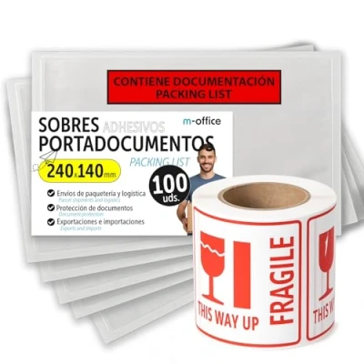 Pack of paper bags + rolls of "FRAGILE" label: the size of the envelope is 240x140 mm, perfect for inserting folded A4 sheets, invoices, transport documents and any type of shipping documentation. WATER AND DUST RESISTANT - Made of clear and durable plastic that protects documents during transportation, preventing damage from moisture or dirt. STRONG & SECURE ADHESIVE - Self adhesive envelopes that securely fix on boxes, courier envelopes and pallets, ensuring your documents travel always protected. Ideal for exports and imports: perfect for international shipments where it is mandatory to attach proforma invoices, customs documents or certificates, always visible and protected.