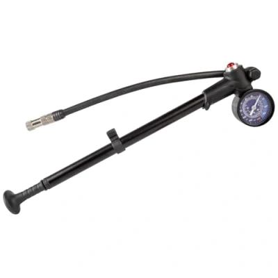 Controlled air release button. Half pushed through: permanent deflation. Fully pushed through: gradual deflation High performance pressure gauge up to 28 bar / 400 psi With foldable, flexible hose, therefore small and handy even for on the go AV and FV valve head with thread for better fixation Material: aluminium
