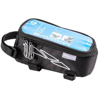Fix mounted by 3 velcros, reinforced bottom, shock absorbing soft padding, showerproof material with zipper Touchpad usable through water protected, transparent top window pocket, reflectors on the sides Suitable for all popular I-Phones and smartphones, size: approx. 17 x 8 x 8 cm (L x W x H)