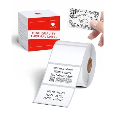 Label Size - 40 mm x 30 mm (1.57 "x1.18 "); Color: Black on White; Labels per Roll:230 Multipurpose - A wide variety of label sizes are available for use in different applications. You can use this small size label to make product labels, price tags and more Thermal Paper Features - Self-adhesive Multi-Purpose labels are water resistant, oil resistant, abrasion resistant, strong adhesion and BPA free Clear Printing - Direct thermal print technology provides clear printing content, without messy, expensive ink or toner Compatible with Phomemo M110, M220, M221, M150, M250, M108, M100, M120, M200 and Memoking M260 Label Printer