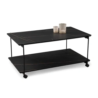 Design: The Passo 2 coffee table impresses with its modern, elegant design in elegant marble look with Swiss edge and black metal frame, perfect for stylish living spaces. Material: Made of high quality MDF in marble look for the deck and shelf panels, combined with a sturdy black metal frame for strength and durability. Dimensions: with the dimensions 100 x 45 x 62 cm, the coffee table offers plenty of space for decorations, magazines and drinks, suitable in front of any sofa or in any living area. Features: Integrated castors allow maximum flexibility and easy movement of the table, ideal for different living situations and spontaneous remodeling.