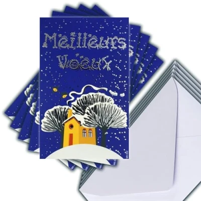 M5 502 Set of 5 Identical Greetings Cards Silver 13.5 x 8.5 cm + White Envelopes 14 9 Happy New Year Wishes January Winter House and Trees Under the Snow Created Printed Made in France