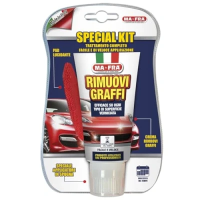 CONTENT - At home you will receive a 100ml pack of Mafra Scratch Remover Kit and Microfibre Polishing Pad. REMOVES SCRATCHES: Thanks to its concentrated micro-particle formulation, it eliminates surface scratches and softens deeper scratches from all painted car surfaces. It contains special polishing agents that restore tone and shine to the treated part. METHOD OF USE: Start by washing and drying beforehand the part of the bodywork to be treated, apply a small amount of product with circular movements and light pressure, then remove the product with the microfibre pad supplied. METHOD OF USE: Shake the can well, spray the product evenly on the ice formations, after a few seconds wipe dry and finally switch on the windscreen wipers. WARNING: After each use unscrew the special sponge applicator. Rinse it with soap and water and screw it back into place. Also wash the polishing pad well with soap and water to remove product residues. MA-FRA: MA-FRA has been synonymous with excellence in cleaning since 1965, ranging from the automotive to the industrial and domestic sectors. Our history, full of dedication, has turned cleaning into an art, marked by continuous success, constant innovation and deep respect for the environment. Each of our formulations, strictly Made in Italy, encapsulates a passion for quality and attention to customer needs, offering cutting-edge solutions.
