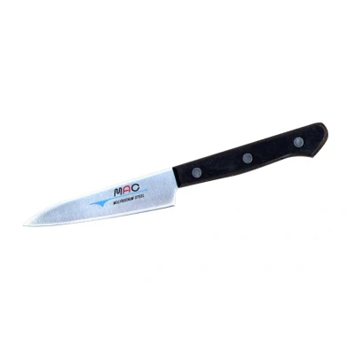 The perfect knife for the kitchen, this Paring Knife from MAC is a high carbon Chrome Molybdenum Vanadium steel blade for better edge-retention. Made in Japan with a 25-year warranty and 57-61 Rockwell hardness, this knife has the perfect balance of weight distribution and strength. With a 15° blade angle, it glides through cuts with ease. The handle is made of Pakkawood, which has the look and feel of natural wood; it’s durable and lasts much longer than other materials.