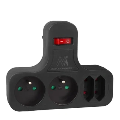 Splitter for four sockets 2 flat and 2 grounded Built-in ON/OFF switch - Built-in child protection Stabilizing foot - Product meets CE European standards Color: black