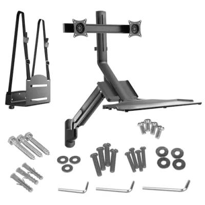 ▶ 3 in 1 sit-stand workstation: 2-compartment monitor holder with keyboard shelf plus computer holder ▶ Monitor holder is suitable for up to two LED LCD QLED OLED monitors with screen diagonals from 17 to 32 " ▶ You can use the flexible gas spring system to find the optimal height and easily set the perfect viewing angle ▶ Compatible with VESA standard: 75x75, 100x100 ▶ Full Motion: Pivoting, tilting and rotating ▶ Simple and stable wall mounting ▶ Adjustable shelf with large surface (66x22cm) offers enough space for mouse, keyboard and more ▶ Height adjustment allows you to work in a sitting or standing position - Additional computer holder with adjustable width ▶ A good alternative to a standard desk