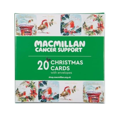Macmillan Christmas Robins Charity Cards Pack of 20 Luxury and Eco Friendly Cards. Boxed Multipack 4 Seasonal Designs. 127x127mm Card Size.