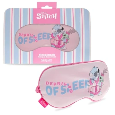 DESIGN: Official Stitch sleep mask with adorable pattern and soft colors in pink and pastel blue Optimal comfort: soft and lightweight padding with adjustable elastic for a peaceful and comfortable sleep PREMIUM MATERIALS: Made of silky and skin-friendly fabric, with a high quality finish Practical dimensions: universal size suitable for all faces, with an ergonomic design perfectly covering the eyes UNIQUE STYLE: Funny message 'Deprived of Sleep' with Stitch artwork, perfect for fans