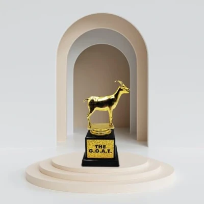 The Greatest of All Time This trophy is not only an original gift, but also honors the person who receives it as the Greatest of All Time. Honor to whom honor deserves: The trophy consists of a golden goat on a black base. The goat symbolizes the strength and endurance of the G.O.A.T. The pedestal is decorated with the inscription "The G.O.A.T". A real eye-catcher: the glass is approximately 12 cm high and is made of high-quality plastic. So it is an eye-catcher in any room. Cleanliness: To ensure it remains the G.O.A.T. forever, we recommend cleaning the trophy only by hand and with a damp cloth., Manufacturer: Mad Monkey