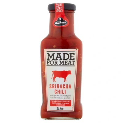Kuhne Made for Meat Sriracha Chilli Sauce 235ml is a bold, spicy chili sauce made with ripe chilies, fresh garlic, and bell peppers. Ideal as a marinade or condiment for meat, fish, or vegetables, it contains no artificial colors or flavors and is suitable for vegetarians.
