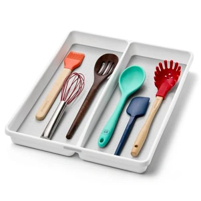 The madesmart antimicrobial Large Classic Utensil Tray is a two-compartment tray ideal for organizing kitchen utensils in most drawers Rounded corners and soft-grip lining make this utensil tray highly functional, easy-to-clean, and aesthetically pleasing Features non-slip feet and soft-grip lining to ensure items stay in their place Why Antimicrobial? Antimicrobial INHIBITS the growth of bacteria that causes stain and odor on the product’s surface, REINFORCES the integrity of the product, and PROVIDES a long-lasting organization experience for ultimate peace of mind