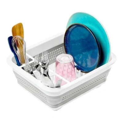 Store and organize dinnerware and glassware while drying silverware and kitchen utensils Flexible material allows dish rack to collapse flat to save space and make the most of your kitchen countertop Can be used with a drying mat or drain board Separate area for silverware, utensils, and other gadgets for more organized drying Dimensions: 14. 63 L x 12. 63 W x 2. 75 H in (37. 16 x 32. 08 x 6. 99 cm); expanded height: 5. 5 in (14. 00 cm)