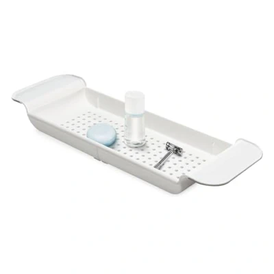 EXPANDABLE BATHTUB AND SHOWER SHELF: Offers a practical solution to organizing your bath and shower essentials, keeping them easy to locate and within close reach EASY TO EXPAND: Can quickly and easily be expanded from 21.8" to 30.87" in length to offer a perfect fit for most bathtubs or showers VERSATILE BATH STORAGE: Perfect for holding a variety of bath products such as body wash, hair soaps, razors and shaving cream, wash cloths, body scrubbers, brushes, and much more ERGONOMICALLY DESIGNED: Soft-grip handles keep the shelf securely in place to prevent slipping from the edge of your tub during use, and the large drainage holes promote fast drying HIGH-QUALITY CONSTRUCTION: Made from durable BPA-free plastic for easy maintenance and years of quality bathtub organization