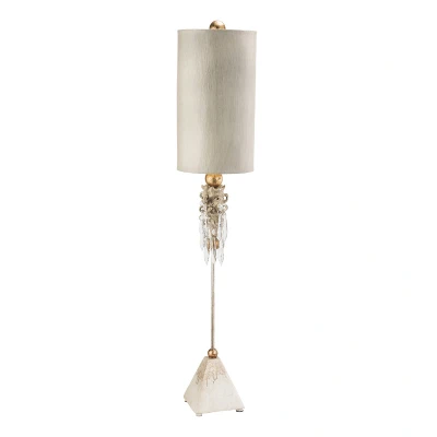 This table lamp consists of a pyramid shaped base in a putty patina finish. The metal stem supports a decorative sculpted element, and gold coloured spheres. The sculpted decoration is adorned with hanging crystals. The fitting is finished with a matching putty shade in cylinder shape. This fitting is the ideal choice for providing extra light to dimmer parts of the room.