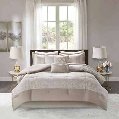 The Madison Park Ava 7 Piece Chenille Jacquard Comforter Set offers a luxurious update to your bedroom décor. The luxurious taupe comforter and shams flaunt a pieced design with stripes of textured chenille jacquard that creates a stunning three dimensional effect. Two square decorative pillows and one oblong pillow are stuffed with hypoallergenic filling and feature embroidery and pleating details that provide elegant touches for the top of the bed. comforter and shams: Chenille jacquard with charmuse, pieced, filling:8oz/sq yard polyester, bed skirt and pillows: charmuse 1 Comforter:104"W x 92"L, 2 King Shams:20"W x 36"L + 1.5 "D (2), 1 Bedskirt:72"W x 84"L + 15"D, 3 Decorative Pillows:16"W x 16"L/12"W x 18"L/18"W x 18"L Machine Washable, Spot Clean Pillows