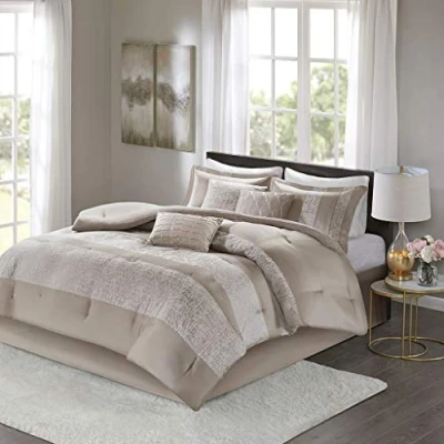 The Madison Park Ava 7 Piece Chenille Jacquard Comforter Set offers a luxurious update to your bedroom décor. The luxurious taupe comforter and shams flaunt a pieced design with stripes of textured chenille jacquard that creates a stunning three dimensional effect. Two square decorative pillows and one oblong pillow are stuffed with hypoallergenic filling and feature embroidery and pleating details that provide elegant touches for the top of the bed. comforter and shams: Chenille jacquard with charmuse, pieced, filling: 8oz/sq yard polyester, bedskirt and pillows: charmuse 1 Comforter: 104"W x 92"L, 2 King Shams: 20"W x 36"L + 1. 5 "D (2), 1 Bedskirt: 78"W x 80"L + 15"D, 3 Decorative Pillows: 16"W x 16"L/12"W x 18"L/18"W x 18"L Machine Washable, Spot Clean Pillows.Jacquard fabric