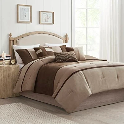 Madison Park All Season Down Alternative Cozy Bedding with Matching Shams, Decorative Pillows, Faux Suede Polyester, Brown 7pcs, Queen