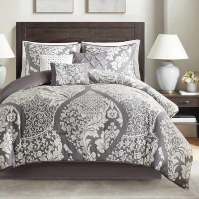 The Madison Park Vienna 7 Piece Cotton Printed Comforter Set offers an eye-catching update to your bedroom décor. A beautifully intricate damask pattern is flaunted across the comforter and shams, for a chic transitional look. Cotton cover is Oeko-Tex certified to be free of any chemicals and harmful substance paired with hypoallergenic filling for a perfect all season bedding. Set includes: 1 Comforter: 104"W x 92"L, 1 Bed Skirt: 78"W x 80"L + 15"D, 3 Pillows: 18"W x 18"L/16"W x 16"L/12"W x 16"L, 2 King Shams: 20"W x 36"L + 2"D Care instructions: machine washable