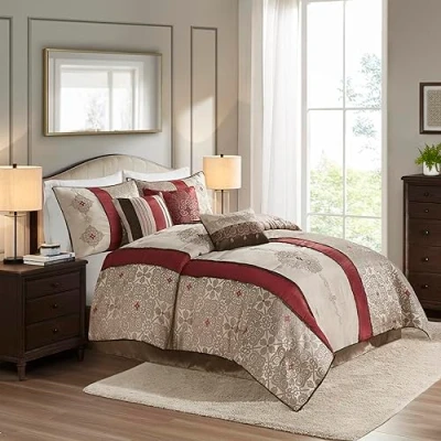 Madison Park All Season Set, Matching Bed Skirt, Decorative Pillows, Polyester, Donovan, Red Medallion, Queen(90"x90")