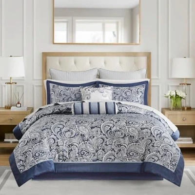 Madison Park Cozy Comforter Set, Faux Silk Jacquard Paisley Design, Polyester, Navy Biab 12pcs, Queen