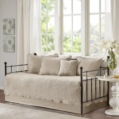 Madison Park Daybed Cover Set Damask Quilted for Daybeds, All Season, Pre Washed Cotton Filled Coastal Bedding with Scallop Edge, Shams, Bedskirt, Décor Pillows, Tuscany, Khaki 6 Piece