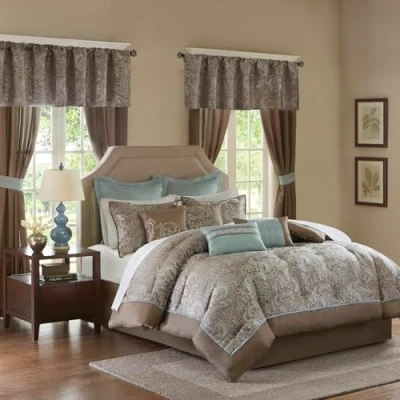 STYLE - Modern traditional elegant style cozy comforter set, so you can update your bedroom decor with a luxurious room décor. Faux silk with jacquard paisley design added luxurious fabric texture complement this classic traditional styling comforter. The matching ensembles for the entire bedroom mirror the design of the comforter, while the solid color reverse balances the look. 4 decorative pillows in embroidery design and pleating details complete the look of this classic traditional style comforter set MATERIAL - Feel the gentle faux silk comforter set which offers ultra soft feel and luxurious jacquard texture bedding cover. The faux silk fabric will also make you feel extra cozy giving you a better quality rest every night ALL SEASON - Our all season comforter sets offers a soft fabric reverse. Madison Park Essentials bedding collection aims to offer you a better quality sleeping experience. With the right amount of hypoallergenic down alternative filling, our cozy bedspread will give you the right amount of warmth and comfort for year round use Set includes: 1 Comforter:90x90", 1 Bed Skirt:60x80+15", 1 Flat Sheet:90x102", 4 Window Curtains:42x84", 2 Euro Shams:26x26+2", 2 Pillowcases:20x30", 2 Standard Shams:20x26", 4 Decorative Pillows: 16"W x 16"L (1) /12"W x 18"L (2) /18"W x 18"L (1) 1 Fitted Sheet:60x80+14", 2 Window Valance:18x54", 4 Tiebacks:4x23" Care instructions: Machine wash, gentle cycle and separately. Spot clean decorative pillows. Do not bleach. Tumble dry low, remove promptly. Do not iron. If there is no free movement in the washer or dryer, use large capacity commercial washer/dryer.