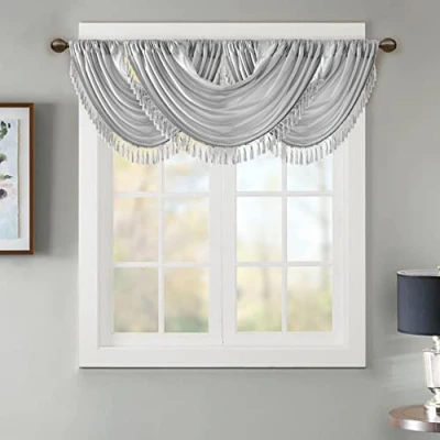AmazonBring style and sophistication to your windows with our Elena Waterfall Valance. This elegant valance features rich central drape details and beautiful tassel trim, combined with faux silk fabric for a rich sheen and elegant update. This window blind is also OEKO-TEX certified, which means it does not contain harmful substances or chemicals, ensuring quality comfort and well-being. 1 window valance: 38" x 34" Care Instructions: Machine Washable