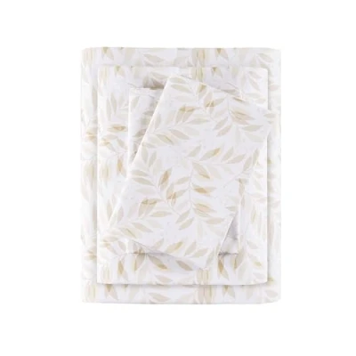 Madison Park Essentials 100% Cotton Sheets, Breathable&Soft Bed Printed Design, Elastic Pocket Sheet Set Fits Up to 17" Mattress, All Season, Queen Tan Leaves 4 Piece