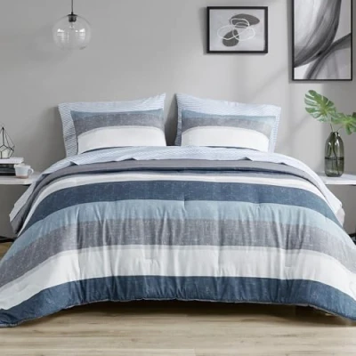 Revamp your bedroom style with the Madison Park Essentials Jaxon bed in a bag, comforter and sheet set Stripe comforter look in grey, navy, blue for casual and modern bedroom style with simple coordinating stripe design on sheet set Enjoy the soft microfiber that is an ultra-fine fiber, lightweight and durable fabric for all season comfort Set include: 1 Comforter: 104"W x 92"L, 2 King Shams: 20"W x 36"L, 1 Flat Sheet: 108"W x 102"L, 1 Fitted Sheet: 72"W x 84"L + 14"D, 2 King Pillowcases: 20"W x 40"L Care Instructions: Machine washable for easy care; comforter set may come in rolled or compressed packing and will need to be fluffed up. Use a steam iron to help remove wrinkles easier.