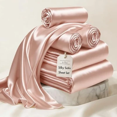 Madison Park Essentials Satin Sheet Set Luxury and Silky with Natural Sheen, Premium 16" Deep Pocket, All Around Elastic Year Round Bedding, Full, Blush, 6 Piece