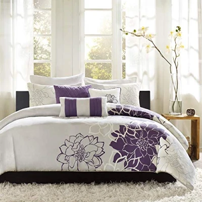 Madison Park Lola 100% Cotton Duvet Set Beautiful Floral Pattern, Ruffle Border Design All Season, Breathable Comforter Cover Bedding, Matching Shams, Full/Queen(90"x90"), Purple/Grey 6 Piece