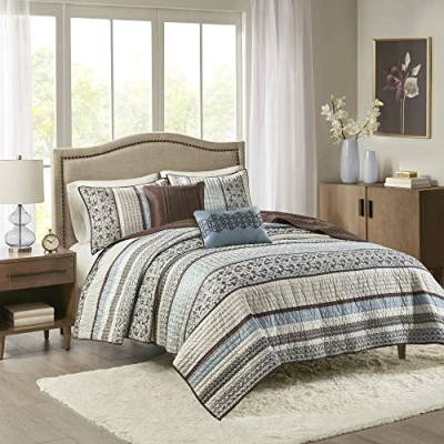 Madison Park Quilt Set Luxurious Jacquard Stripes Design, Polyester, Floral Blue, King/Cal King(104"x94")