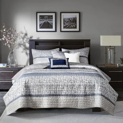 Madison Park Reversible Quilt Luxury Jacquard Design All Season, Breathable Coverlet Bedspread Double Bedding Set Matching Shams, Decorative Pillow, Full/Queen(90''x90''), Rhapsody, Navy 6 Piece
