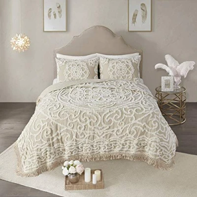 Madison Park Shabby Chic Boho Medallion Design, Tassel Fringe Bedspread, Shams, Cotton, Laetitia, Taupe Coverlet, Full/Queen