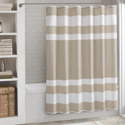 Modern Farmhouse – The Madison Park Spa Waffle Shower Curtain showcases a waffle weave texture, pieced together in a chic taupe and white palette. This stylish design delivers a modern update to your bathroom décor, offering a cozy and inviting ambiance Premium Quality – This modern farmhouse shower curtain boasts a 190GSM weight and 3M Scotchgard moisture management, effectively wicking moisture to maintain a fresh look longer, ensuring effortless care Privacy and Style: The Spa Waffle farmhouse-style boho shower curtain adds decorative charm while ensuring privacy. For best results, a shower liner is recommended. It features buttonholes for shower hooks (not included) Size Options: The stall shower curtain measures 36"W x 72"L and comes in various sizes to suit your needs. Enhance your bathroom aesthetic by pairing it with the coordinating Spa Cotton Bath Rug, sold separately Durable & Easy Care: Our shower curtain boasts quality stitching offers durability to withstand daily wear and tear. For easy care, simply machine wash separately in cold water on a gentle cycle and tumble dry on low heat