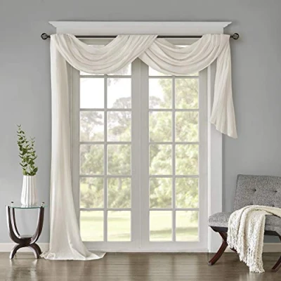 Comes with 4 tabs for easy assembly Coordinate with window panel for complete look DIY and drape to best fit your window Lightweight sheer crushed fabric for texture Layer for custom look 100% Polyester 1 Window Scarf:42"W x 216"L Machine Washable
