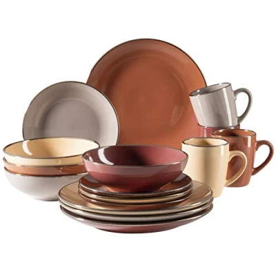 This elegant yet modern design tableware set contains 4 flat dinner plates (diameter 27 cm), 4 dessert plates (diameter 19.6 cm), 4 coffee mugs (400 ml capacity) and 4 multi-purpose bowls (diameter 18.6 cm, 700 ml) Each piece in the tableware set is 1 in these harmoniously coordinated colours: taupe, beige, terracotta, mahogany red With rich shades, round coupe shapes without border and metal-coloured border, the "Metallic Rim" tableware series from the Austrian traditional brand Mäser presents itself smart and elegant at the same time Durable dishwasher and microwave safe - this service set as well as the whole "Metallic Rim" series is not only suitable for festive occasions, but also perfect for everyday use Made from stoneware (a high-quality shape of ceramic), this dinner set stands out from classic porcelain crockery