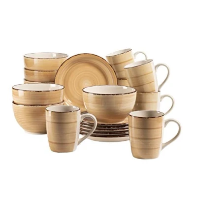 This breakfast set consists of 6 large coffee cups (390 ml), 6 cereal bowls and 6 dessert plates in beige. It can also be used as a modern coffee service The colourful Bel Tempo collection is handmade from beautiful thick-walled stoneware (a traditional shape of ceramic) and hand-painted with rustic playful lines in wood look Dishwasher-safe, microwave-safe, no absorption and release of moisture: the new generation Bel Tempo II combines the comfort of a porcelain crockery with the incomparable feel of real earthenware tableware The Bel Tempo series harmoniously combines classic round shapes with a colourful vintage look and will make your breakfast something very special Combine this breakfast set with a 12-piece Bel Tempo dinner service to get an individual crockery set in your personal colour combination