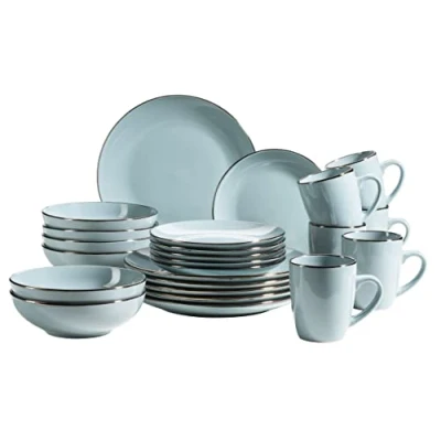 This elegant yet modern design tableware set contains 6 flat dinner plates (diameter 27 cm), 6 dessert plates (diameter 20 cm), 6 coffee mugs (400 ml capacity) and 6 multi-purpose bowls for cereal, soup and much more (diameter 18.6 cm, 700 ml) - each in light blue With rich shades, round coupe shapes without border and metallic shimmering border, the metallic rim tableware series from the Austrian traditional brand Mäser presents itself smart and elegant at the same time Durable dishwasher and microwave safe - this service set as well as the whole dinnerware series Metallic Rim is not only suitable for festive occasions, but also perfect for everyday use Made from stoneware (a high-quality shape of ceramic), this tableware set stands out from classic porcelain crockery This dinner set will be a versatile eye-catcher on your dining table